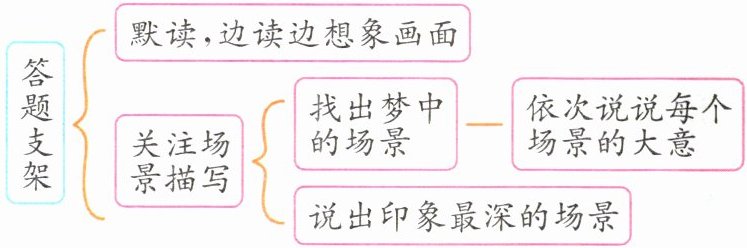 - 默读课文,说说在“我”的梦中出现了哪些难忘的场景,哪个场景给你的印象最深。$\n$参考答案:父亲卖茧买枇杷给“我”吃、要加钱给“我”换房间、买豆腐脑给“我”吃、糊万花筒、背“我”上学、替“我”铺床、借船送“我”上学、为“我”缝补棉被……其中,背“我”上学这一场景给我的印象最深。雨雪天,路面湿滑,父亲背着“我”艰难前行,可见父亲对儿子的深爱,也流露出儿子对父亲的感激之情。