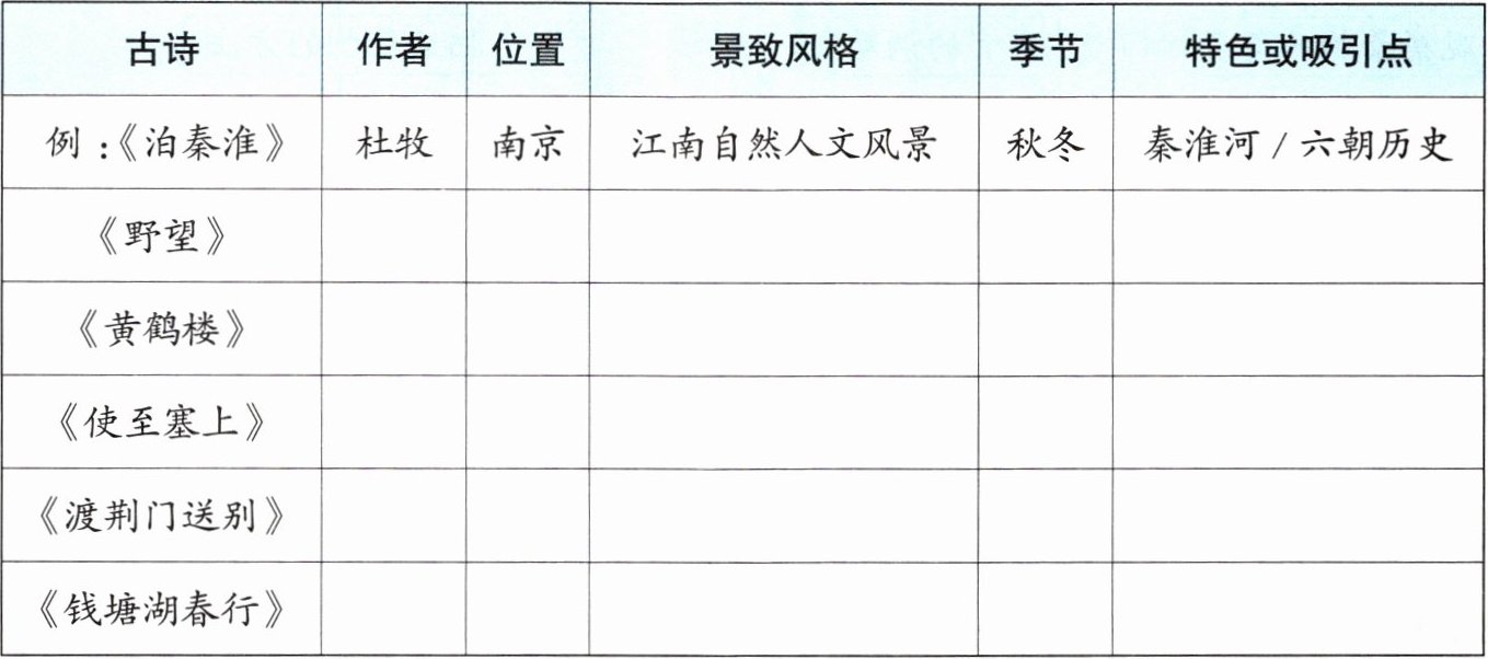 一、每个人的经历不同、喜好不同,选择的游玩之地也不同。了解不同的景致,才能选择不同的远方,走好自己的路。结合课下注释,疏通诗意,感知五首唐诗所描述的景色风格,完成下列表格。