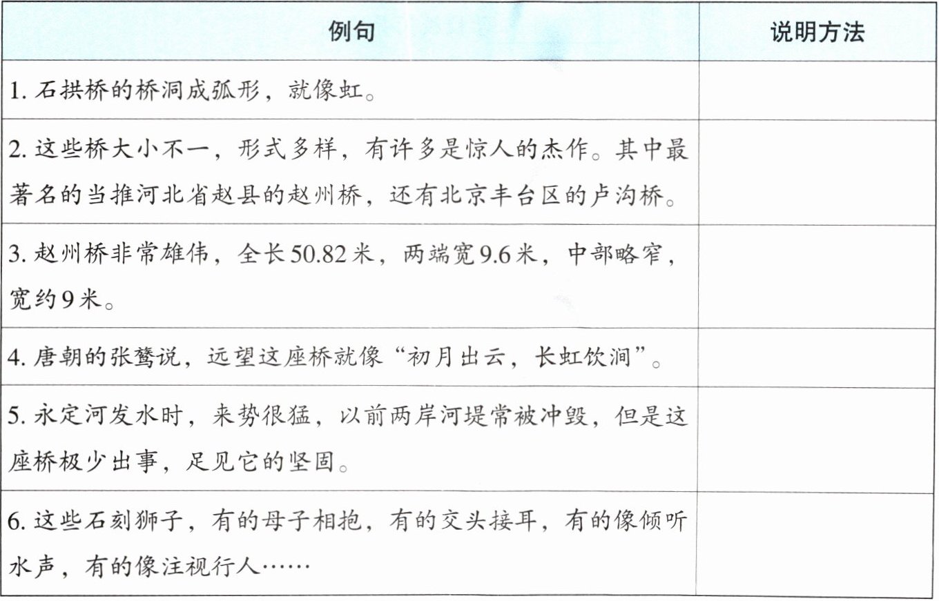 说明文常用的说明方法有举例子、列数字、作比较、下定义、分类别、画图表、摹状貌、引资料等。请和小组同学合作,梳理本文的说明方法,并完成表格。