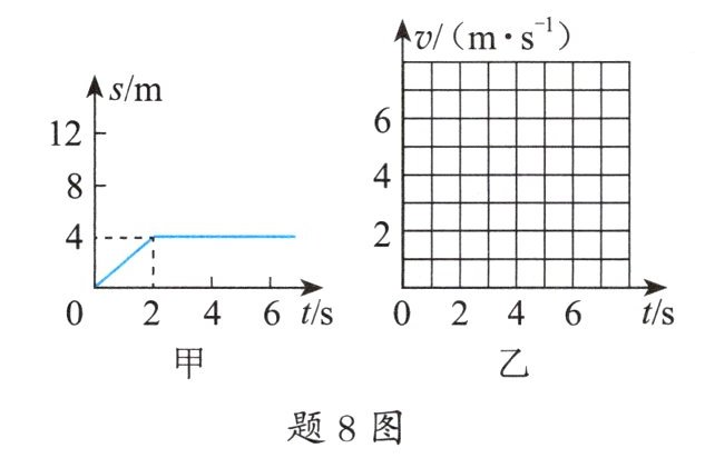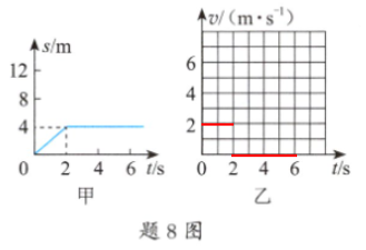 8. (2 分)题 8 图中,图甲是某物体运动的$s-t$图像,请在图乙中画出该物体在 0 ~ 6 s 内的$v-t$图像。