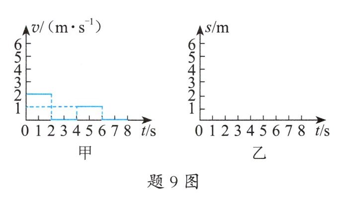9. (4 分)某同学沿直线骑车然后步行的$v-t$图像如题 9 图甲所示,请在题 9 图乙中画出该同学 0 ~ 8 s 内的$s-t$图像。