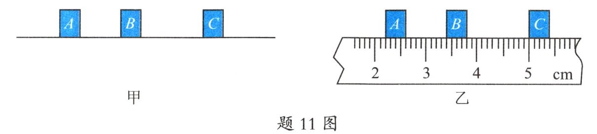 11. 如题 11 图甲所示是木块在水平面上运动时连续相等时间内拍摄的“频闪”照片,已知两次拍摄的时间间隔为 0.02 s,照片与实物的对应比例尺为 1 : 5。小明把三个位置分别标记为$A$、$B$、$C$,用刻度尺测得照片中$AC$之间的距离(如题 11 图乙所示)为______ cm,由此求得木块从$A到C$运动过程中的平均速度为______ m/s;由图乙可判断小车做______(匀速 / 变速)直线运动。