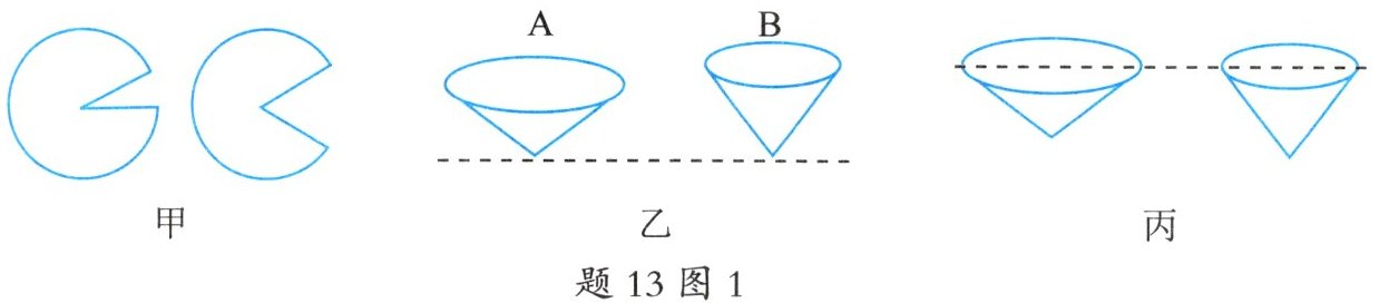 (1)如题 13 图 1 甲所示,剪两个等大的圆纸片,其中一个圆纸片裁去的扇形的圆心角比另一个大,做成两个锥角不等的纸锥。将两个大小不同的纸锥从