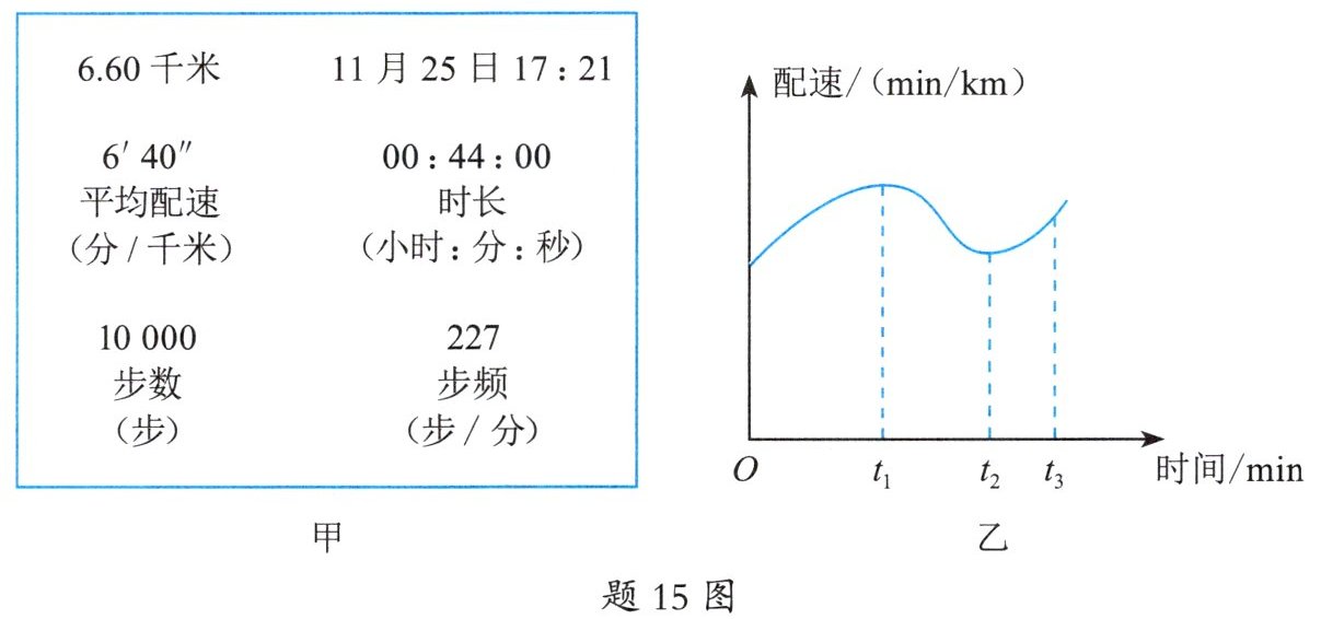 。(3)若跑步者的“配速”随时间变化的图像如题 15 图乙所示,在$t_{1}$、$t_{2}和t_{3}$三个时刻中,运动得最慢的是______