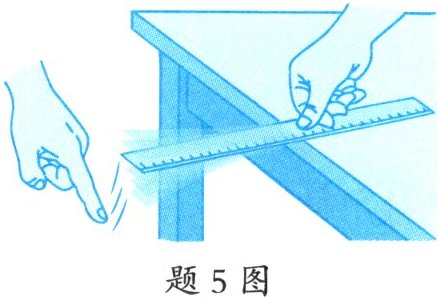 5. 如题5图所示,将塑料刻度尺的一端紧压在桌面上,另一端伸出桌边,拨动刻度尺使其振动,听刻度尺发出的声音。
