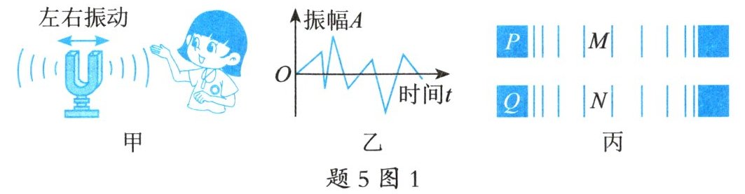 5. 如题5图1甲所示,将敲响的音叉在耳边慢慢转动,会听到时强时弱的声音。音叉的两个叉股就是两个声源,两个声源发出的疏密相间的波传播到一点,会相互影响。根据这一原理,科学家开发出一种“以声消声”的反噪声技术。简单地说,就是用话筒将噪声收集起来传送到专门的电脑进行分析,根据分析结果通过喇叭发出相应的噪声,恰能将原来噪声的振动抵消,这种“以声消声”的方法称作“有源消声技术”。目前这一技术已经应用到空调器、大功率冰箱及汽车发动机的制造中。