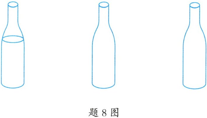 8. (4 分)小德同学在做水瓶琴实验,如题 8 图所示,他从左至右依次敲击 3 个瓶子,发出的声音分别为“1(do)”“3(mi)”“5(sol)”,发现音调逐渐变高,请你画出剩余两个水瓶的水面大致高度。