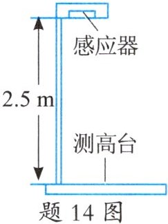 14. 题 14 图是一种身高测量仪,其顶部的感应器竖直向下发射超声波信号,经下方物体反射回来被感应器接收。某同学站上测高台,感应器记录超声波信号从发射到接收所经历的时间为 $ 5 × 10^{-3} $ s。已知感应器距测高台的高度为 2.5 m,空气中的声速为 340 m/s,则该同学的身高为