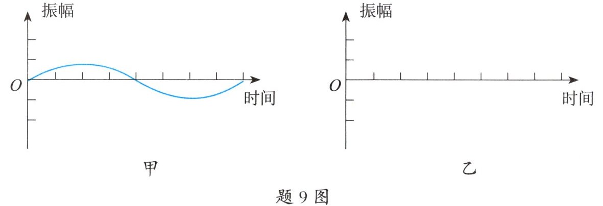 在题9图乙的坐标图中,绘制一个与题9图甲波形形状相同,但振幅为题9图甲2倍的波形图。