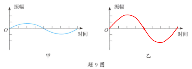 9. (2 分)题 9 图甲为某种声音输入到示波器上时显示的波形图。请在题 9 图乙的坐标图中画出音调不变,响度为题 9 图甲 2 倍的声音波形图。