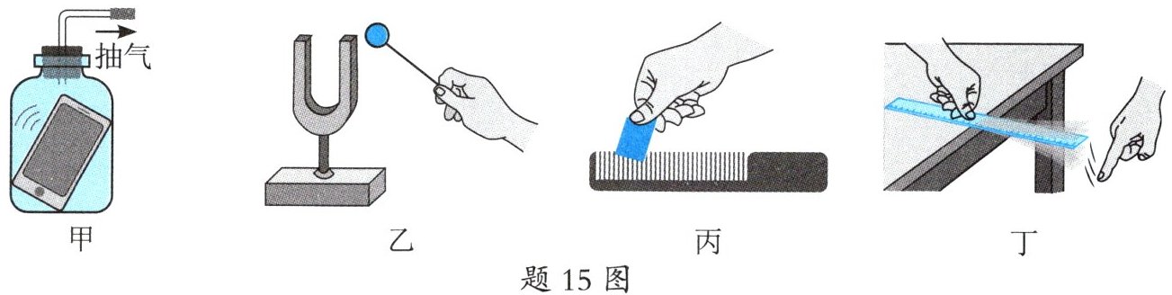 (4)如题 15 图丁所示,改变塑料尺伸出桌边的长度,用同样大小的力拨动,听到塑料尺振动发出的声音