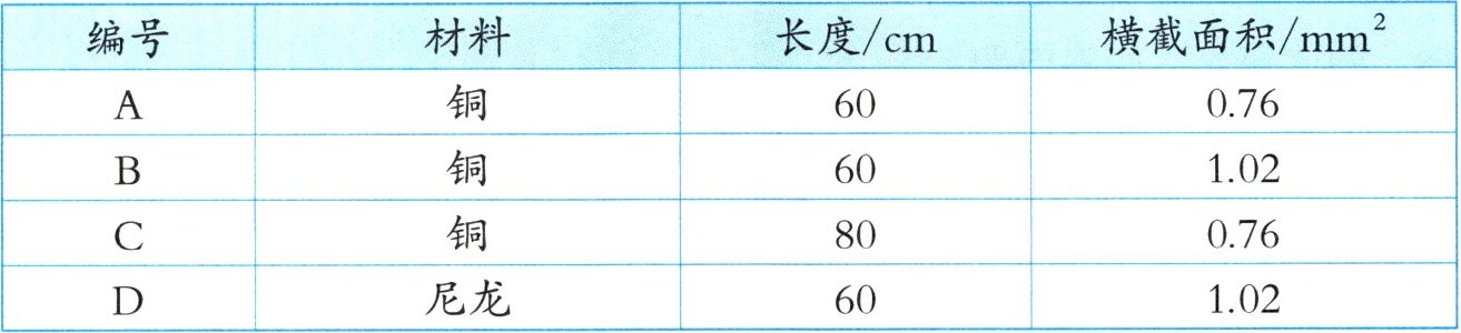 |编号|材料|长度/cm|横截面积$/mm^2$|
