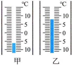 - 甲图中温度计的分度值为$1^{\circ}C$,液柱在$0^{\circ}C$以下,示数为$-6^{\circ}C$,读作“零下六摄氏度”;