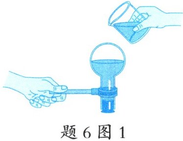 6. (1)如题6图1所示,将盛水的烧瓶加热,水沸腾后把烧瓶从火焰上拿开,并迅速塞上瓶塞,再把烧瓶倒置后向瓶底浇上冷水,观察到烧瓶内的水会再次沸腾。这是因为烧瓶内水面上方的气压