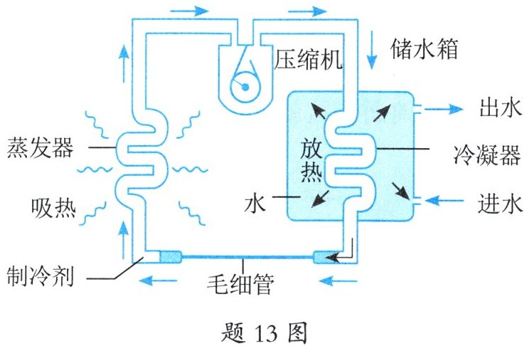 空气能热水器是吸收空气的热能来产生热水的装置。如题 13 图所示是空气能热水器的工作原理示意图,它主要由储水箱、毛细管、蒸发器、压缩机、冷凝器等部件组成。制冷剂是一种在常温下极易汽化的液体,它在毛细管、蒸发器、压缩机、冷凝器之间的循环过程与我们所熟悉的电冰箱的制冷循环过程相同,其工作过程如下: