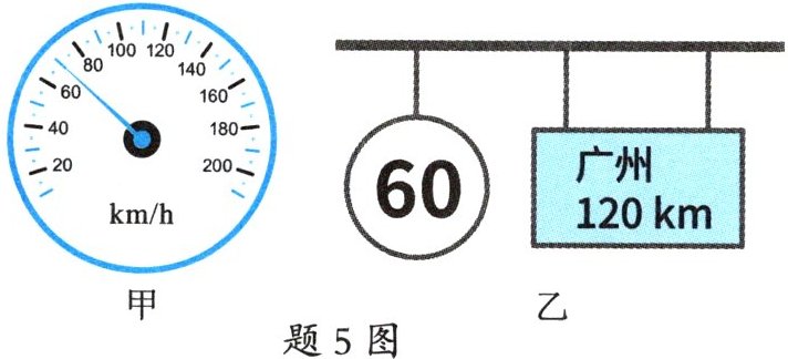5. 星期天,爸爸开车带着小明去广州游玩。当汽车开到某路段时,小明观察到汽车上的速度计示数如题5图甲所示,此时汽车行驶速度为