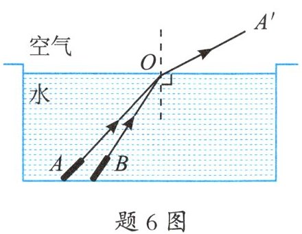 6. 如题6图所示,观光水池中,一束光沿AO方向从水射入空气,折射光线为OA'。若另一束光沿BO方向从水射入空气,请大致画出入射光线BO的折射光线,并标出对应的折射角r。