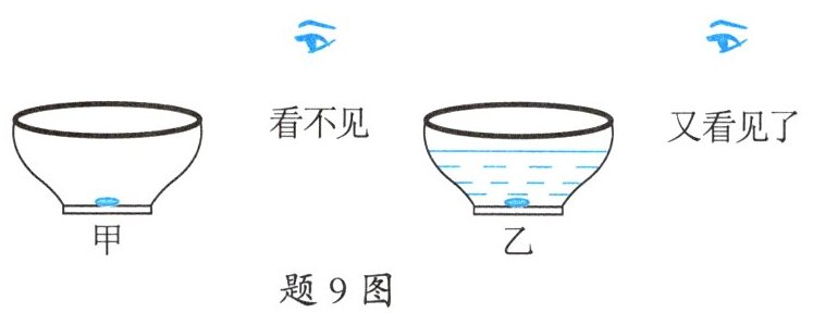 9. 如题9图所示,在空碗中放一枚硬币,从侧面观察,使其恰好不被看到,保持眼睛和碗的位置不动,缓慢往碗中倒水,可以观察到此硬币。试问,倒水前看不到硬币、倒水后看到硬币的原因是什么?请画出恰好能看到硬币时的光路图。