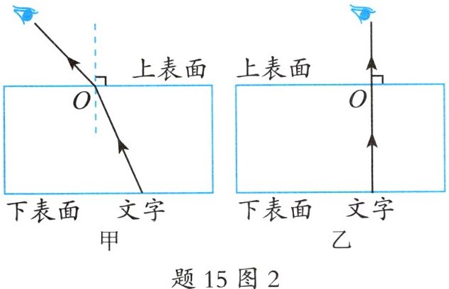 (4)实验结束后,小明将该玻璃砖放在物理书上,观察发现文字在实际位置的上方,于是得出结论说:“透过玻璃砖看到的文字在实际位置的上方。”同组小华听到后说:“我看到的文字的位置变化不明显。”一起探究后,小明和小华画出了各自看到的文字的光路图,如题 15 图 2 所示。你认为图