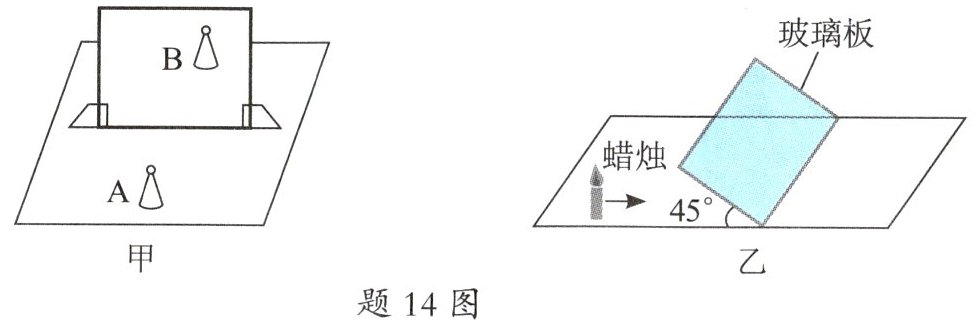 (变大 / 变小 / 不变)。(5)如题 14 图乙所示,将玻璃板与水平桌面成 45°角固定在水平桌面上,让蜡烛沿着桌面向右做直线运动,将看到蜡烛在玻璃板后的像