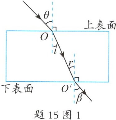 。(3)实验过程中,小明多次改变入射角 θ,并使每次的入射点始终为 O 点,标记出对应的从下表面射出的 O'点,并在白纸上连接对应的 OO',然后测出从空气射入上表面的入射角 θ 和折射角 i,以及从玻璃下表面射入空气的入射角 r 和折射角 β。题 15 表是记录的实验数据。