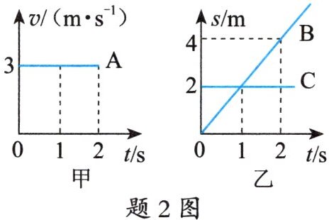 2. 如题2图所示,甲、乙两个图像分别描述了做直线运动的三个物体$A$、$B$、$C$的运动情况,下列说法错误的是(