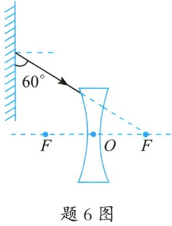 6. 如题6图所示,光线经过平面镜反射后射向凹透镜,请画出射向平面镜的入射光线和经过凹透镜后的折射光线,并在图中标出入射角的度数。