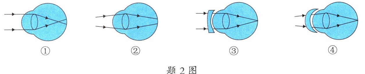 2. 长时间玩电子产品对视力有很大的影响,容易造成眼睛近视,在如题2图所示的四幅图中,分别表示近视眼成像情况和矫正做法的是(