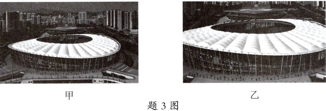 3. 小深用一架焦距不变的照相机先拍了深圳某体育馆的照片(如题 3 图甲所示),接着他又拍了一张照片(如题 3 图乙所示),下列说法正确的是(