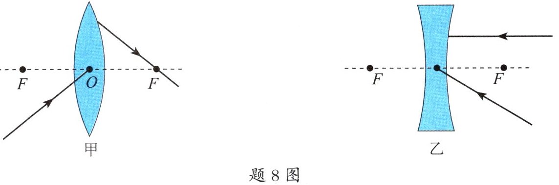 8. (4 分)如题 8 图所示,根据透镜的性质,完成光路图:画出折射光线或入射光线。