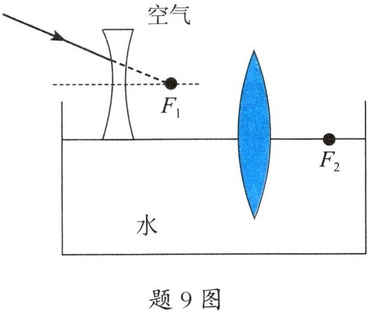9. (3 分)如题 9 图所示, $ F_1 $、$ F_2 $ 分别是两透镜的焦点,凸透镜的主光轴与水面重合,一条光线经凹透镜折射后射向凸透镜,最后射入水中。请画出射向凸透镜的入射光线和经过凸透镜后的折射光线,以及折射入水中的光线。