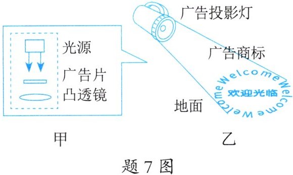 7. 题 7 图乙是小深家附近商场的广告投影灯,其内部结构如题 7 图甲所示,镜头焦距为 $ 20 \, cm $。下列分析不正确的是(