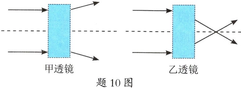 10. 如题 10 图所示是小欣同学用激光分别射向甲、乙两透镜后光的传播路径,由图可知甲透镜应是