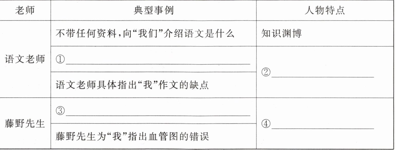 ①选择典型事例。《回忆我的语文老师》一文选择“不带任何资料,向‘我们’介绍语文是什么”“课间恰逢下雨,她即兴教我们赏雨”和“语文老师具体指出‘我’作文的缺点”等典型事例,表现了语文老师知识渊博、教学有方、严格要求等特点;《藤野先生》一文选择“藤野先生为‘我’添改讲义”和“藤野先生为‘我’指出血管图的错误”等典型事例,表现了藤野先生严谨认真、严格要求的特点。②人物的语言描写鲜明、有特色。