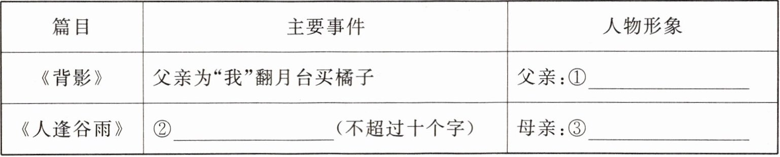 8.疼爱、关心儿子 "他"碰到母亲劳作而醒悟 为家庭、为孩子无私付出、辛勤劳作。9.【甲】文中,"我"流泪是被父亲不顾艰难给我买橘子而感动;"我"拭干了泪是因为怕父亲看见,为"我"担心,也怕别人看见难为情。【乙】文中,"他"流泪是被母亲深爱孩子,为家庭、为孩子无私付出、辛勤劳作而感动得流泪,表现出"他"的感激之情。"他"揩去眼泪是因为"他"体会到了母亲的艰辛,幡然醒悟,内心发生了转变,从侧面体现了"他"的成长。