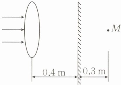 13. 如图所示,把一个凸透镜放在平面镜前,当用眼睛观察平面镜时,光束似乎是从$M$处发散开来的,则该凸透镜的焦距是 (