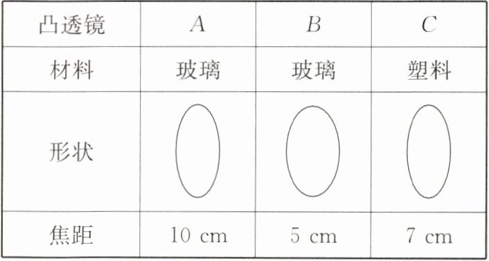 16. 核心素养[科学探究] 小亮手中有三个直径相同、厚度不同的凸透镜A、B、C,分别由玻璃、塑料制成,小亮用正确的方法分别测出了它们的焦距,如表所示,由此可以得出初步的结论:凸透镜的焦距大小与凸透镜的材料和__