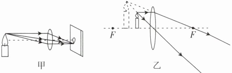 2. 如图乙所示,凸透镜所成的虚像是实际光线的反向延长线会聚而成,光屏上