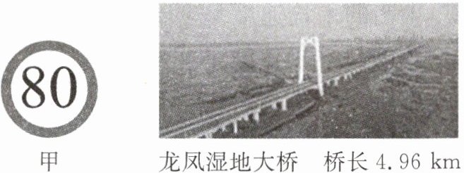 (2)由题意可知:大桥总长 $ s=4.96\ km $,最大车速 $ v=80\ km/h $,由 $ v=\frac{s}{t} $ 得:$ t=\frac{s}{v}=\frac{4.96\ km}{80\ km/h}=0.062\ h $