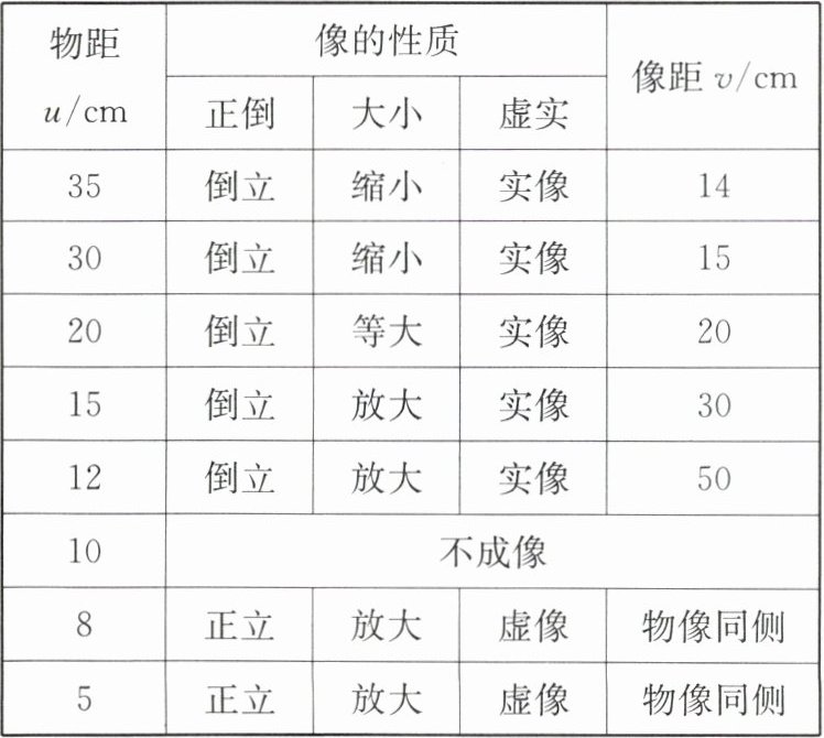 |物距$u/cm$|像的性质|像距$v/cm$|