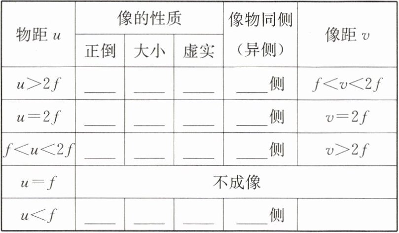 |物距$u$|像的性质|像物同侧(异侧)|像距$v$|