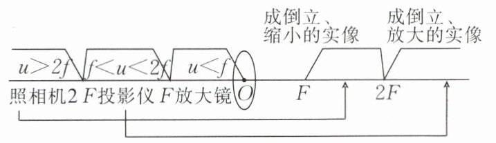 (2)$2f > u > f$,成倒立、放大的实像,$v > 2f$。