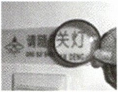 【典题2】小京通过焦距为$10\ cm$的凸透镜看到了提示牌上“关灯”两字放大的像,如图所示。下列说法正确的是(