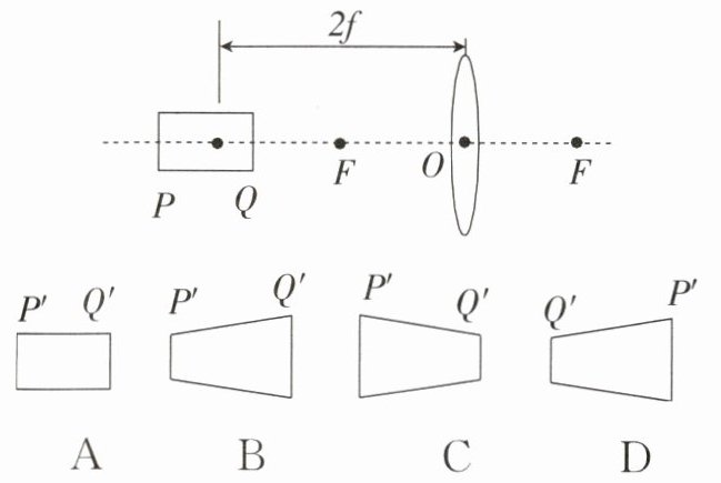 11. 如图所示,有一圆柱体$PQ$放在凸透镜前图示的位置,它所成的像$P'Q'$的形状应该是下列图中的(