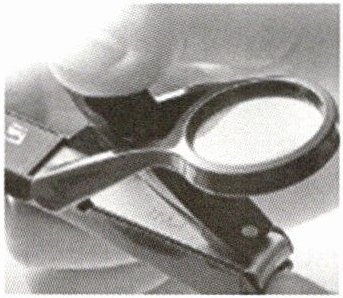 6. (双选)小明送奶奶一个带放大镜的指甲刀(如图所示),放大镜的焦距为$3\ cm$。关于此放大镜,下列说法正确的是(