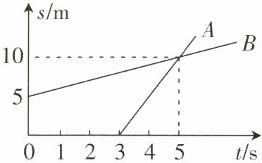 (1)物体 B 的运动速度:$v_B=\frac{s_B}{t_B}=\frac{10\ m-5\ m}{5\ s}=1\ m/s$ 物体 A 的运动速度:$v_A=\frac{s_A}{t_A}=\frac{10\ m}{5\ s-3\ s}=5\ m/s$