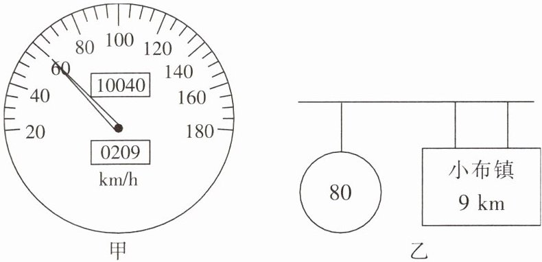 (2)以速度表上的速度行驶,从标志牌处到小布镇需要的时间:t= $\frac{s}{v}$ = $\frac{9\ km}{60\ km/h}$ =0.15 h=9 min