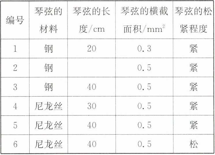 |编号|琴弦的材料|琴弦的长度/cm|琴弦的横截面积$/mm^2$|琴弦的松紧程度|