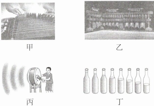 D.图丁中,8个相同玻璃瓶灌入不同高度的水,敲击它们,从左至右音调越来越低