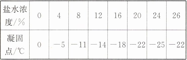 19. 核心素养科学探究 下雪天,小明在放学回家的路上,看到环卫工人向雪中撒盐。这一行为引发了他的思考:雪的熔点可能与所含杂质的多少有关。小明知道,同种物质的凝固点和它的熔点相同。于是,他回家用盐水做了实验,并得到如下实验数据。